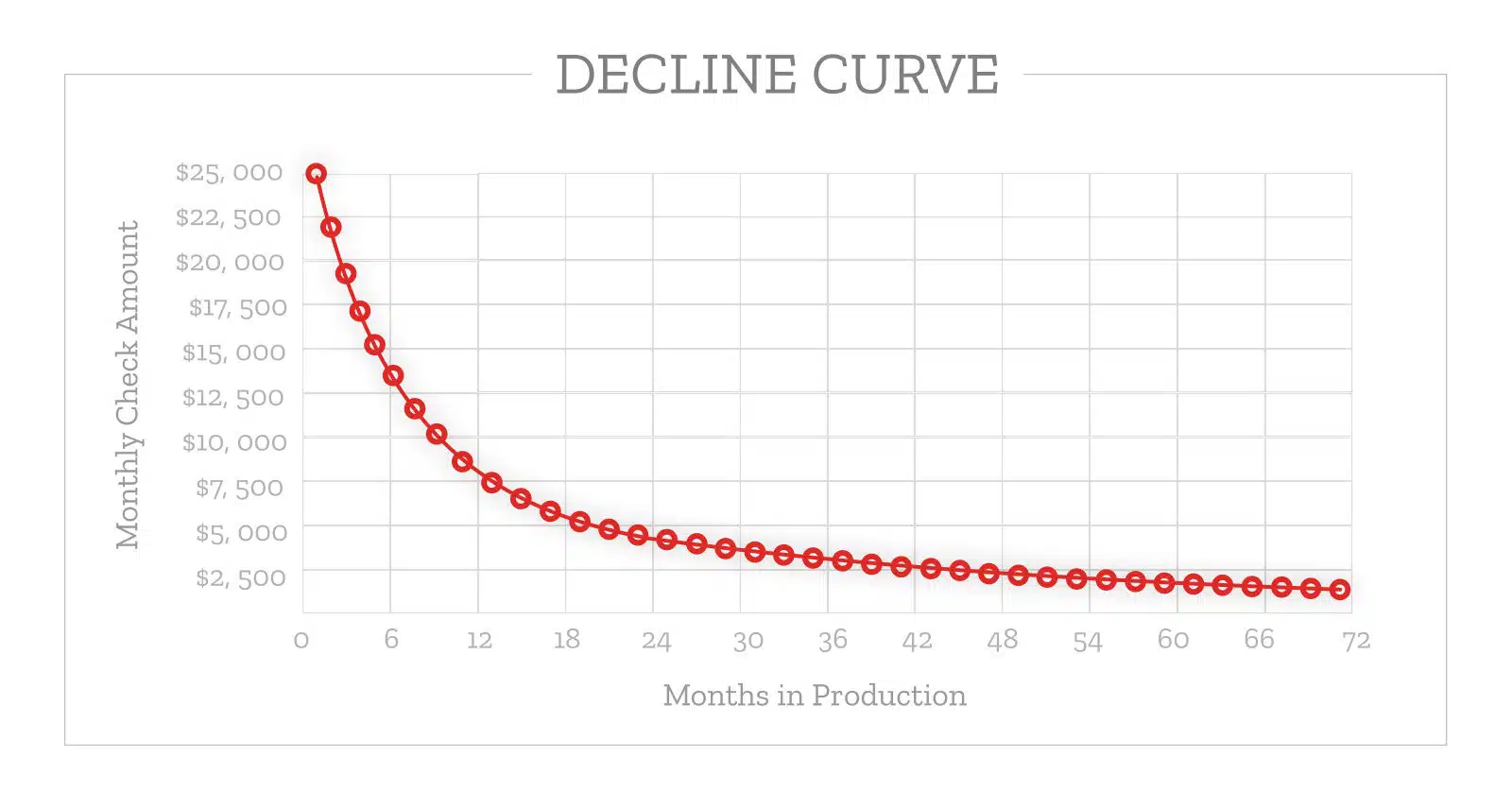 - New Royalty Owners: If you just started receiving royalties checks, the oil and gas decline curve effects you in a big way. Look at the example provided in oil and gas decline curve below. As you can see, during the first 12 months the checks start out very large at about $25,000/year or $2,000/month, then declines all the way to just $3,200/year or $260/month by the 5 year mark. That’s a huge decrease! It’s important to understand that the price you receive right after a well starts producing is NOT what you will receive forever. The first 12 months have the biggest decline. From 12 months to 60 months you will still see a significant decline until it eventually levels off.